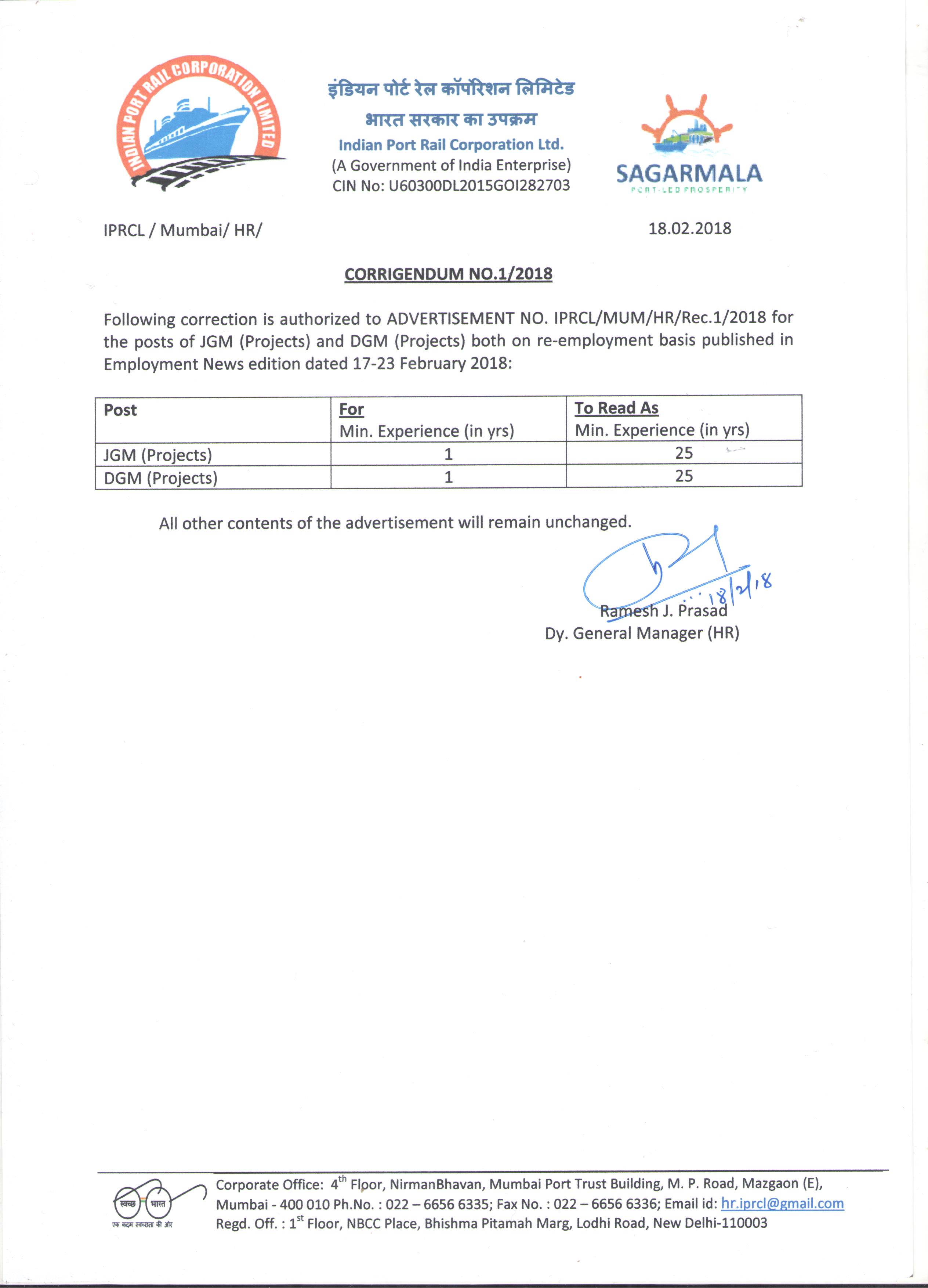Applications are to be addressed to: Joint General Manager (HR), Indian Port Rail Corporation Limited, Corporate Office: 4th Floor, Nirman Bhavan, Mumbai Port Trust Building, M.P Road, Mazgaon (E) Mumbai -400010.